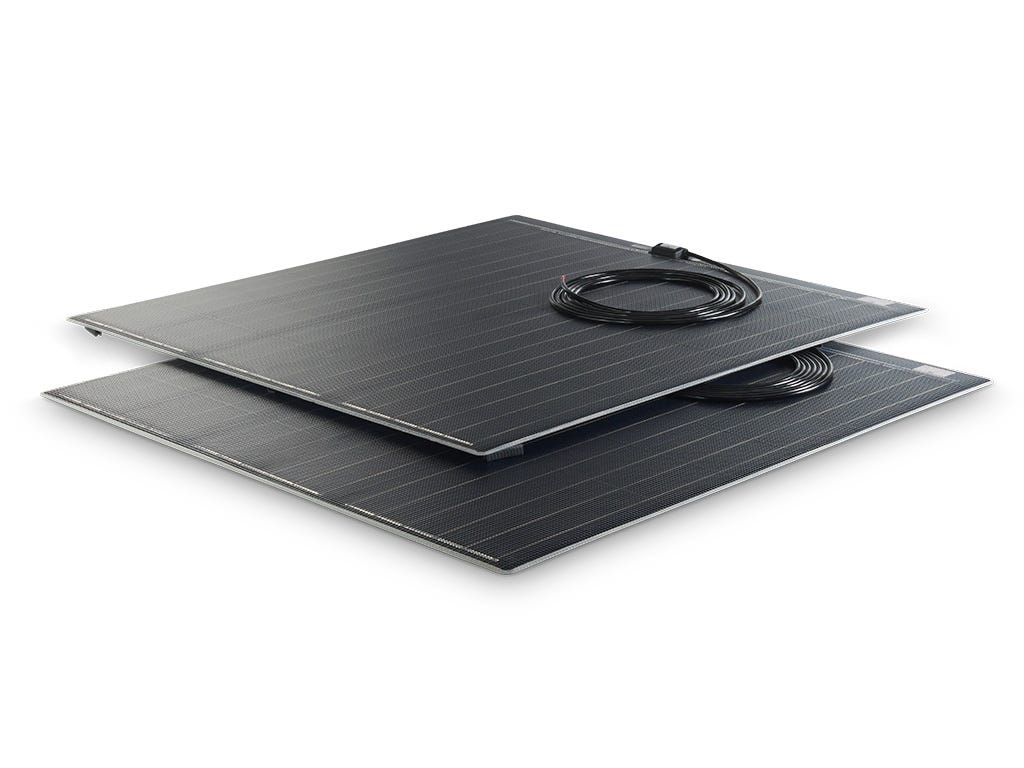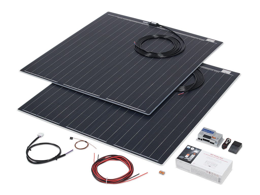 Solar-Komplettanlage, 2 x 170 W, sehr flach. Diese FLAT LIGHT Q Komplettanlage wurde speziell für Camper und Transporter entwickelt. Die zwei sehr flachen, sehr leichten 170-Watt-Solarmodule nehmen nur wenig Platz auf dem Dach ein. Dank der quadratischen Bauform ist die komplette Fahrzeugbreite für die Stromerzeugung nutzbar. Die Ladeleistung reicht aus, um eine Kompressorkühlbox oder einen Wechselrichter autark zu betreiben.
