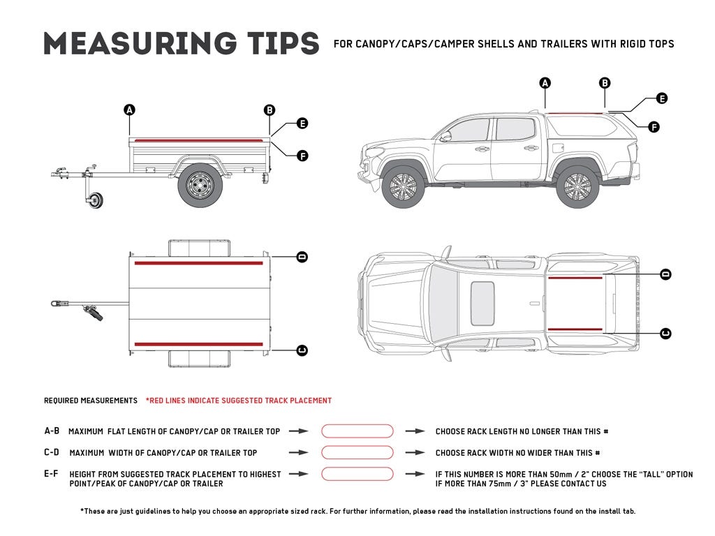 Dieses Dachträger Kit ist für Pick-up Hardtops / Anhänger geeignet, deren Dach nicht größer als 1358 mm (L) x 1255 mm (B) ist. Die Slimline II Plattform und 6 mitgelieferte Befestigungsfüße werden auf den mitgelieferten Schienen installiert.Die 3 140 mm langen Schienen (Paar) werden einfach auf Deinem Hardtop / Anhänger montiert.Weitere Informationen findest Du in der Montageanleitung unter dem Reiter MONTAGE.