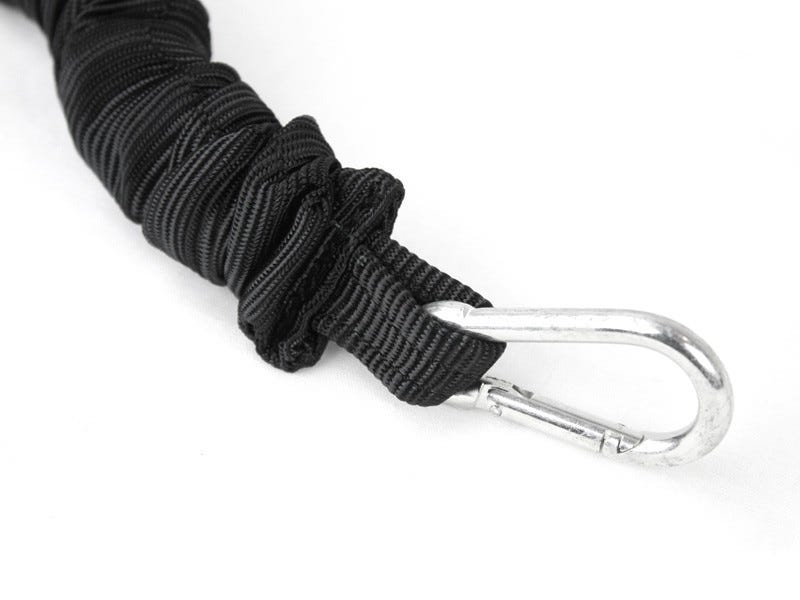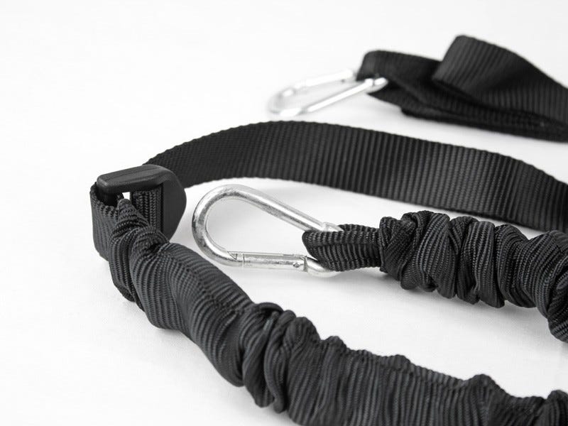 Wird paarweise verkauft Einstellbar von 560 mm bis 1524 mm, mit einer zusätzlichen Länge von 203 mm bei vollständiger Dehnung. Tragfähigkeit von 100 kg Material:Polyester GurtbandLatex Spanngurt7 mm Edelstahl Karabiner Gewicht:Einzeln: 0,23 kgPaarweise: 0,46 kg