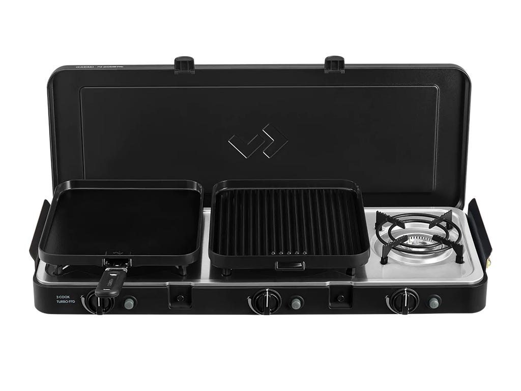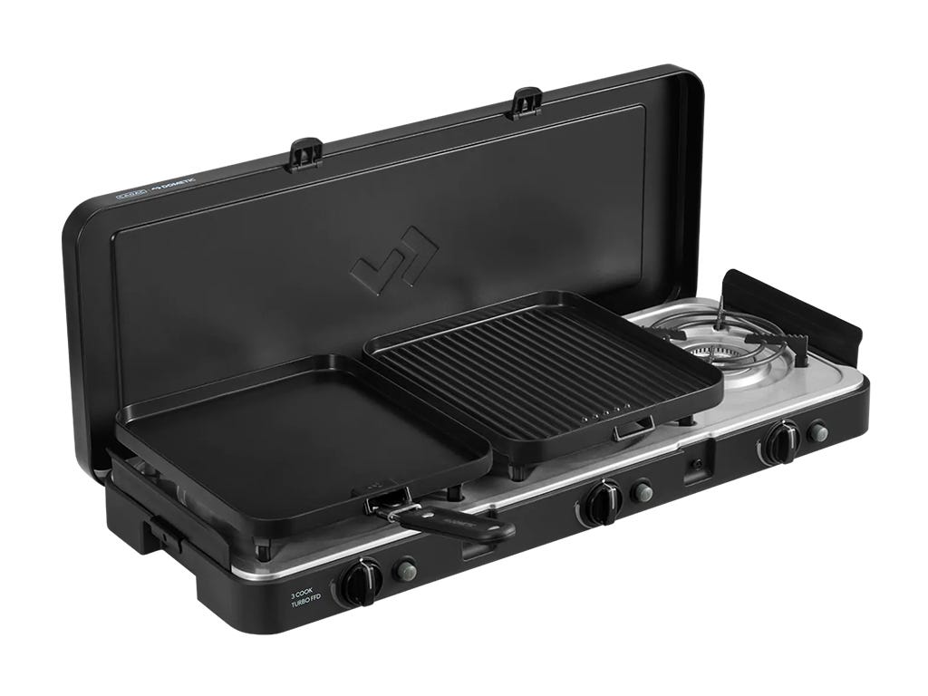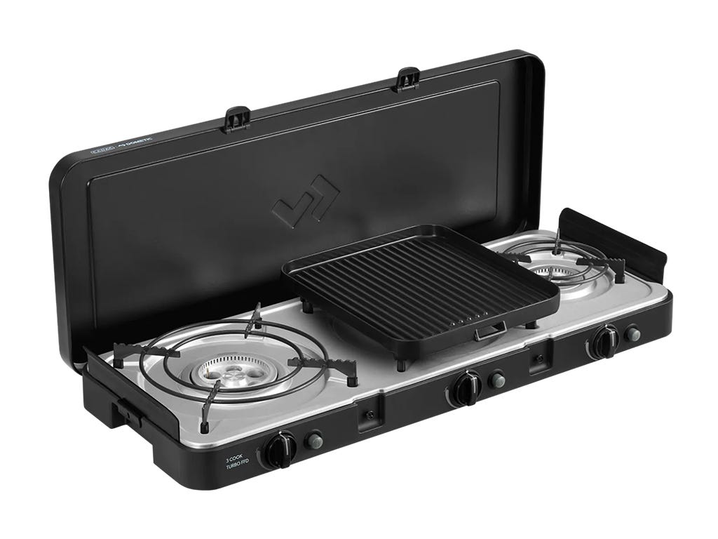 Dieser Gaskocher mit drei (3) unabhängigen Turbo-Brennern bietet viel Platz zum Kochen und ist ideal für Familienessen oder wenn Du Gäste bewirtest.Der dritte, kleinere Turbo-Brenner ist mit einem eigenen Topfständer ausgestattet und eignet sich für Töpfe bis zu 16 cm Durchmesser.Für jeden Brenner gibt es einen eigenen Drehregler, sodass Du die Flammenintensität ganz nach Deinen Bedürfnissen einstellen und die perfekte Kochtemperatur erreichen kannst.Für zusätzliche Sicherheit sorgt die integrierte Flammenausfallsicherung (FFD).Die automatische Piezozündung macht das Anzünden besonders einfach.Zum Lieferumfang gehören 2 Topfständer, eine flache Grillplatte mit GreenGrill-Keramikbeschichtung, eine geriffelte Grillplatte mit GreenGrill-Keramikbeschichtung, Windschutzvorrichtungen sowie ein abnehmbarer Griff für einfaches Anheben.Die Gummifüße sorgen für einen sicheren Stand und verhindern ein Verrutschen während des Gebrauchs.Trotz seiner drei Brenner ist der Gaskocher kompakt, tragbar und lässt sich in der mitgelieferten Tragetasche einfach verstauen.Du erhältst 2 Jahre Garantie.