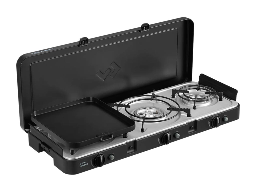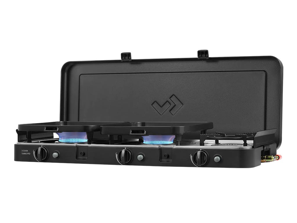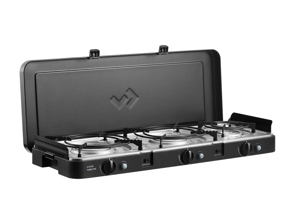 Der 3 Cook Turbo Deluxe Kocher / 30 mbar verfügt über drei hochwertige Brenner und ist damit der perfekte Outdoor-Gaskocher für alle, die viel Essen zubereiten oder eine größere Gruppe versorgen möchten. Du kannst alle drei Brenner gleichzeitig nutzen: Während das Wasser im Kessel kocht, brätst Du auf dem zweiten Brenner Eier und grillst auf dem dritten Gemüse.Jeder Brenner ist mit einer Flammenausfallsicherung ausgestattet, die dafür sorgt, dass das Gas automatisch abgeschaltet wird, falls die Flamme erlischt.