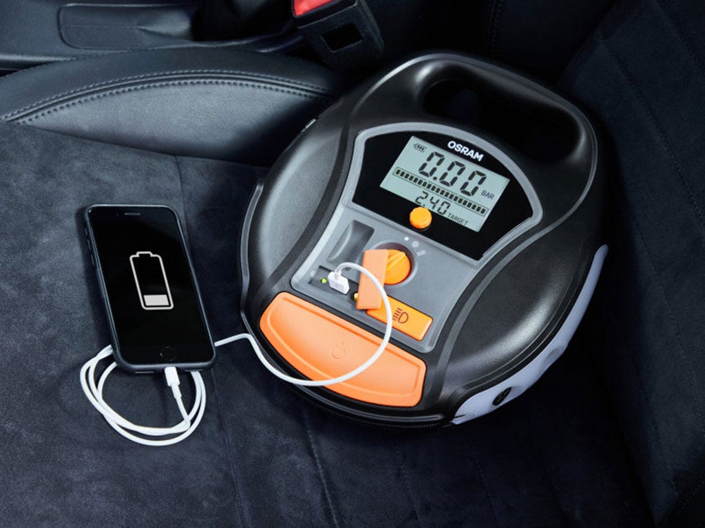 Mit derkabellosen und wiederaufladbarenOSRAM TYREinflate 6000 Reifenpumpe erreichst Du schnell den optimalen Reifendruck.Es dauert nur zwei Minuten, um einen Reifen mit 33 cm Durchmesser aufzupumpen.Inklusive Netzladegerät sowie 12-V-Kabel zur Stromversorgung direkt aus der 12-V-Steckdose im Auto.Die Reifenpumpe kann auch als Powerbank verwendet werden. Perfekt für unterwegs!